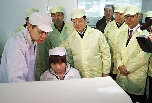 看到展廳中“北部灣單晶硅第一棒”、“創(chuàng)新科海量存儲(chǔ)器”等高端展品,聽(tīng)到冠捷科技、朗科科技等企業(yè)已經(jīng)進(jìn)駐園區(qū),王兆國(guó)十分高興,連聲贊好,對(duì)中電北海產(chǎn)業(yè)園的發(fā)展戰(zhàn)略、創(chuàng)新模式和建設(shè)發(fā)展速度表示贊許;對(duì)中國(guó)電子堅(jiān)持創(chuàng)新、搶抓發(fā)展機(jī)遇,收購(gòu)冠捷、搶占北部灣發(fā)展先機(jī)等舉措給予肯定。王兆國(guó)指出,改革開(kāi)放初期企業(yè)發(fā)展主要是靠土地優(yōu)勢(shì)和勞動(dòng)力優(yōu)勢(shì),而現(xiàn)在要靠科技優(yōu)勢(shì)和服務(wù)優(yōu)勢(shì),誰(shuí)把握了科技優(yōu)勢(shì)和服務(wù)優(yōu)勢(shì),誰(shuí)就能夠贏得發(fā)展先機(jī),希望中電集團(tuán)學(xué)習(xí)、借鑒國(guó)際知名IT企業(yè)的發(fā)展經(jīng)驗(yàn)和失敗教訓(xùn),在自主創(chuàng)新及核心技術(shù)研發(fā)上實(shí)現(xiàn)突破,不斷增強(qiáng)和提升市場(chǎng)競(jìng)爭(zhēng)力,為國(guó)家電子信息產(chǎn)業(yè)的發(fā)展做出更大的貢獻(xiàn),同時(shí)繼續(xù)發(fā)揮央企的引領(lǐng)作用,為地方經(jīng)濟(jì)建設(shè)發(fā)展做出更大的貢獻(xiàn)。