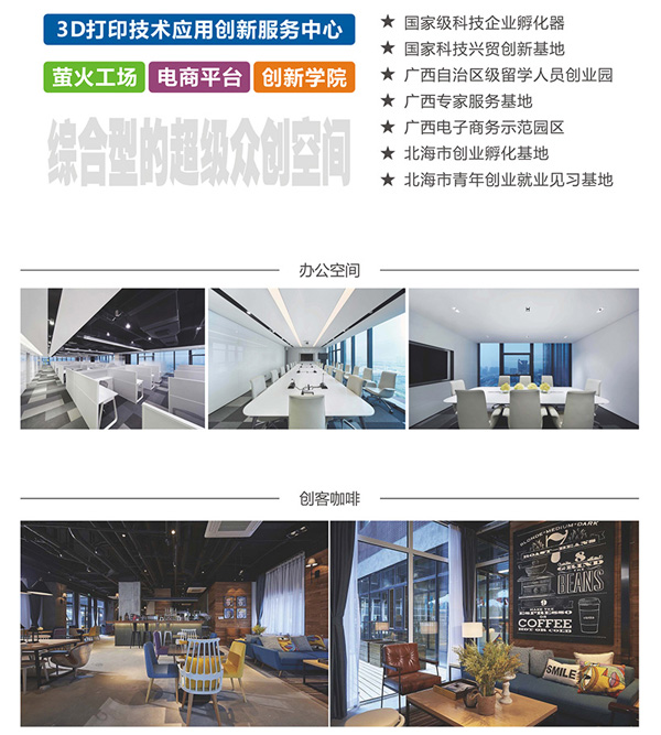 中電北海產(chǎn)業(yè)園眾創(chuàng)空間規(guī)劃面積5000平方米,重點(diǎn)圍繞智慧城市、智能硬件、物聯(lián)網(wǎng)、移動(dòng)互聯(lián)網(wǎng)、大數(shù)據(jù)、電子商務(wù)等重點(diǎn)新型產(chǎn)業(yè)領(lǐng)域,采取互聯(lián)網(wǎng)+現(xiàn)場(chǎng)服務(wù)的模式,整合上下游資源,為入住企業(yè)和創(chuàng)業(yè)者提供政策咨詢(xún)、科研支持、人才引進(jìn)、電商培訓(xùn)、創(chuàng)業(yè)指導(dǎo)、融資對(duì)接等服務(wù),形成支持創(chuàng)新創(chuàng)業(yè)的生態(tài)圈。中電北海產(chǎn)業(yè)園眾創(chuàng)空間通過(guò)整合各方資源,已經(jīng)集成一批面向區(qū)域主導(dǎo)產(chǎn)業(yè)的前沿技術(shù),整合了戰(zhàn)略投資基金、天使基金和社會(huì)投資相結(jié)合的創(chuàng)新創(chuàng)業(yè)投資基金,建立了涵蓋科學(xué)家、創(chuàng)業(yè)企業(yè)家和企業(yè)運(yùn)營(yíng)管理專(zhuān)家的創(chuàng)業(yè)導(dǎo)師團(tuán)隊(duì),聚集電商平臺(tái)、3D打印技術(shù)應(yīng)用創(chuàng)新服務(wù)中心、創(chuàng)新學(xué)院、螢火工場(chǎng)實(shí)驗(yàn)室等一體化服務(wù)機(jī)構(gòu)構(gòu)成綜合型的超級(jí)眾創(chuàng)空間。